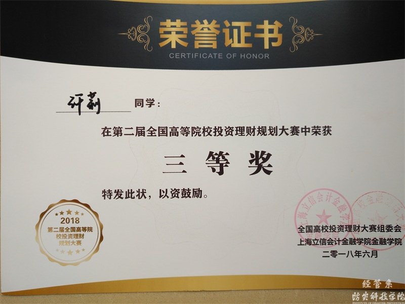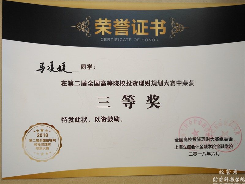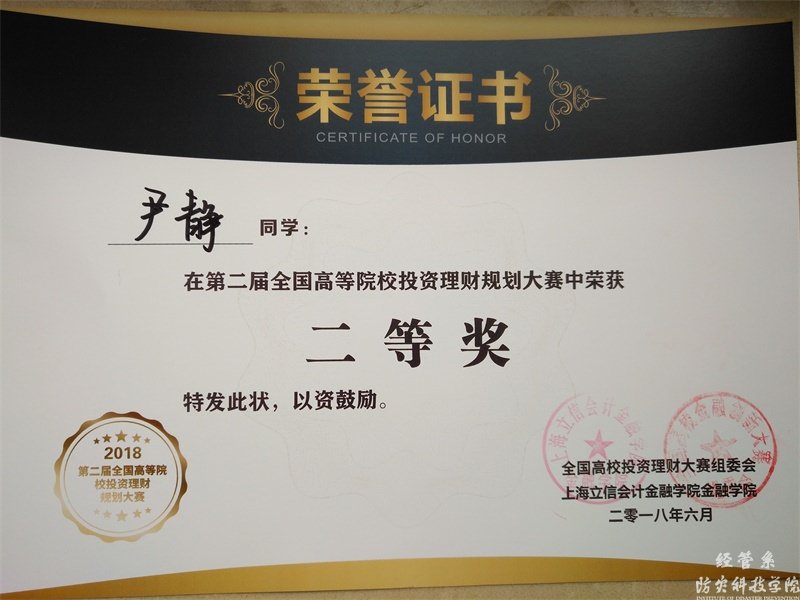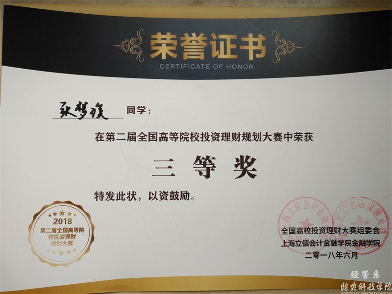 6月2日至3日,第二届全国高等院校投资理财规划大赛在上海立信会计金融公司举行,我系员工尹静、马凌婕、许莉、张梦溪参加比赛,并获得二等奖1项、三等奖3项。