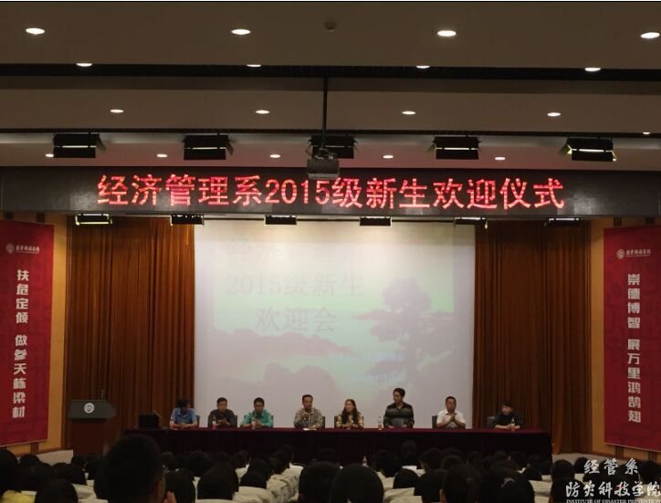 为欢迎新生,帮助新生了解校情校史与所学专业,经济管理系9月15日在图书馆报告厅举行了2015级迎新暨专业教育报告会,系主任刘翠侠教授、系党总支书记谢长旺、各教研室主任、学办主任、新生班辅导员及班主任参加会议,会议由系副主任唐彦东主持。