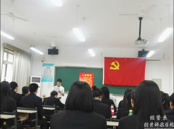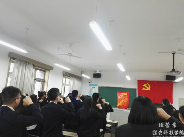 为加强员工党员思想政治教育,强化员工党员意识,提高员工党员质量,经济管理系党总支于2016年6月2日下午组织预备党员在明略楼102教室举行了庄严而隆重的入党宣誓仪式。系党总支书记谢长旺,系党总支组织委员黄义乾,金融学专业党支部书记李魁明以及2015年下半年和2016年上半年发展的预备党员参加了宣誓仪式。