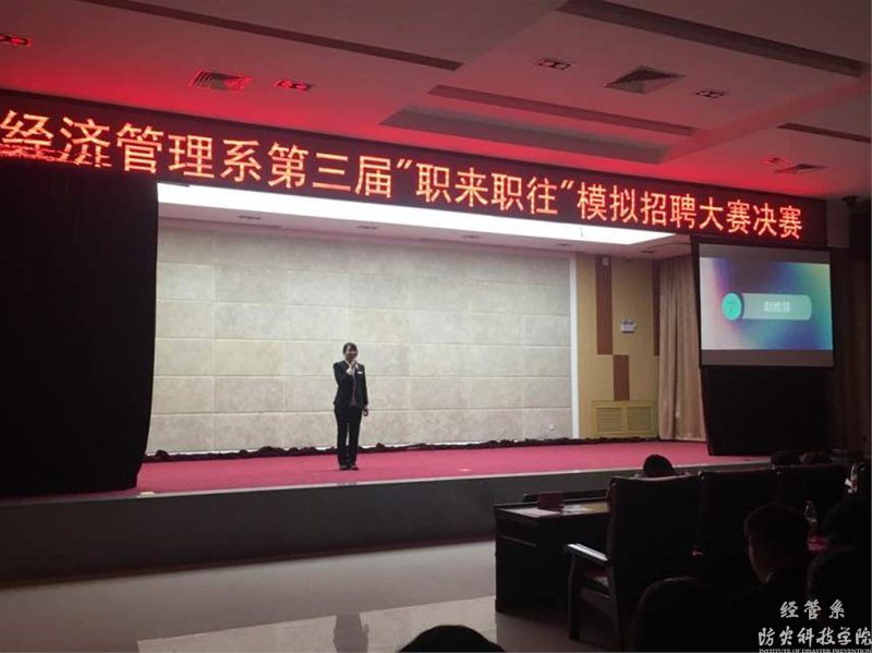 比赛开始前两位主持人向观众们介绍了经由初赛激烈角逐出来的八位选手,首先进行面试常识问答环节,考察了选手在面试中是否注重礼仪细节问题,同时也向观众们传播了面试的常识。随后进行模拟应聘环节,选手用自己精心制作的PPT介绍了自己评委都有针对性地提出了模拟面试问题最后进行的是情景模拟环节,选手们的表现可谓精彩绝伦,赢得了场下观众的阵阵掌声。之后郑建锋老师用幽默的语言进行精彩点评。最后,郑柱根同学夺得了冠军;牛泽润、王茜获得二等奖;陈天睿、王春丽、赵雅慧获得三等奖;优秀奖的获得者是刘鸿、苏荣权等。