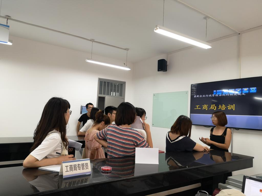 热情并未褪去,新的挑战也已到来。今天明略模拟工业园的各家企业开始“操刀”各项合同,生产运输配货,物流公司的运输订单累计不断,各家企业的财务也忙碌的将各项采购销售业务登记入账。在这一过程中,同学们深切感受到了企业经营对会计工作严谨性的严格要求,有时一项科目或金额发生微小错误,就会牵扯后续很多的工作流程,需要上游企业联系退回、实践平台重新发布任务等操作来挽回。另一边,税务局与工商局分别对各家企业的财务以及行政助理进行了培训指导。税务局讲解了最新的税率规定细则,以及个税企税申报中各种申报手续的办理,一项项细致繁琐的申报工作,引得税务专员黄晓林“焦头烂额”,亲自“下基层”帮忙计算、填报、审查。工商局根据北京市最新的行政管理规定,为大家介绍了一系列企业便利措施,并讲解了需要审核公示的企业年度报告的填制方法。