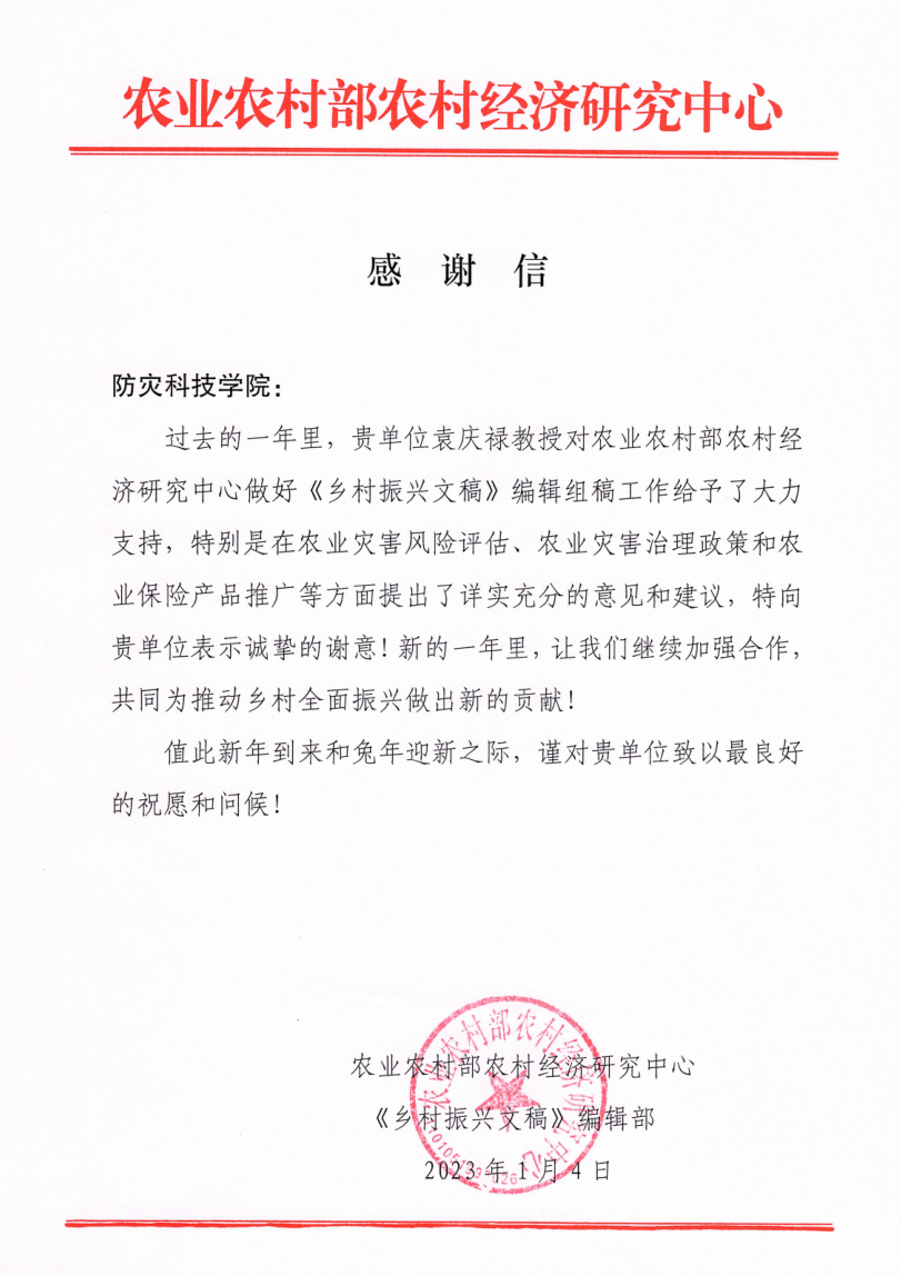 农业农村部农村经济研究中心向公司发来感谢信