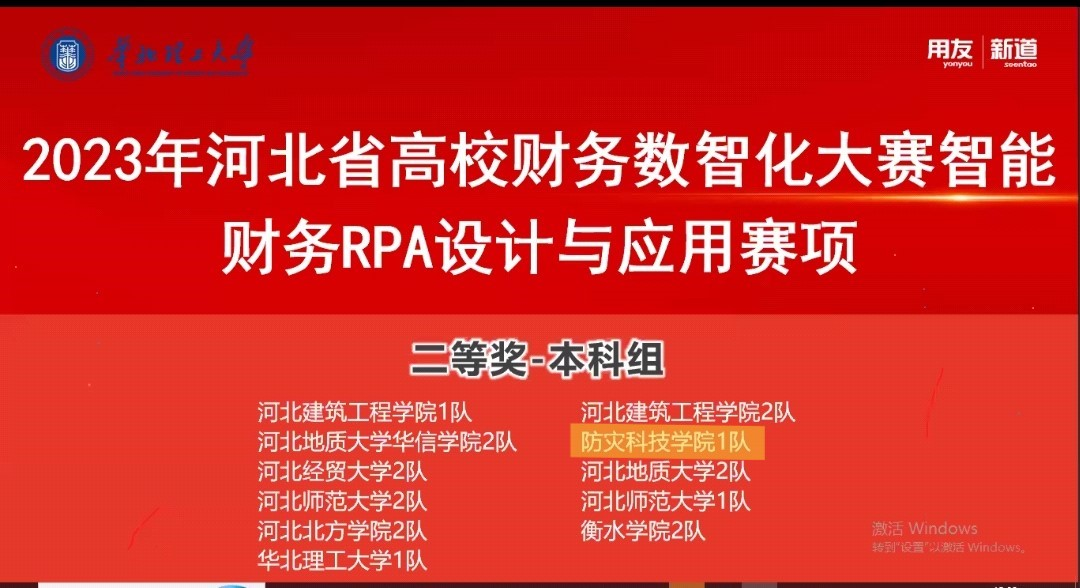 11月17日,河北省财务数智化大赛—智能财务RPA设计与应用赛项成功于线上举办, 此次竞赛由河北省教育厅主办,华北理工大学承办,新道科技股份有限公司负责技术支持。河北经贸大学、河北农业大学等45支本科队伍参加了本次竞赛,由公司王立卫与何红霞两位老师指导,李佳怡、韦雪颀、赵昕玥、左雪芹四名同学组成的队伍在大赛中荣获二等奖。