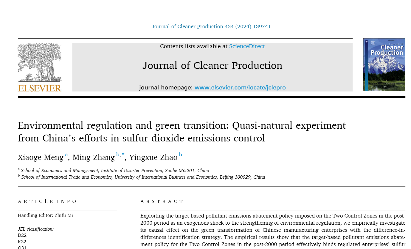 近日,PA游戏官网入口孟晓阁副教授以第一作者、PA游戏官网入口为第一单位在低碳生产与环境经济领域国际权威期刊《Journal of Cleaner Production》(JCR、中科院分区双一区TOP期刊,影响因子11.1)上发表题为“Environmental regulation and green transition: Quasi-natural experiment from China’s efforts in sulfur dioxide emissions control”的高水平论文。该期刊是低碳生产与环境经济领域国际权威期刊之一,旨在报道环境科学和绿色可持续发展方面的最新研究成果。孟晓阁副教授曾在2022年12月以第一作者在JCR一区权威期刊《Computers & Industrial Engineering》发表一篇论文,这是孟晓阁副教授第二次以第一作者在JCR以及中科院分区双一区顶级期刊发表高水平学术论文。