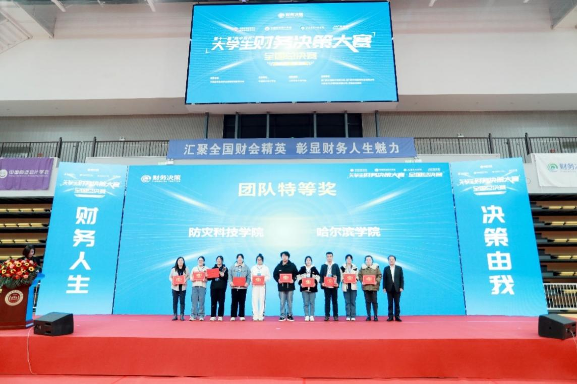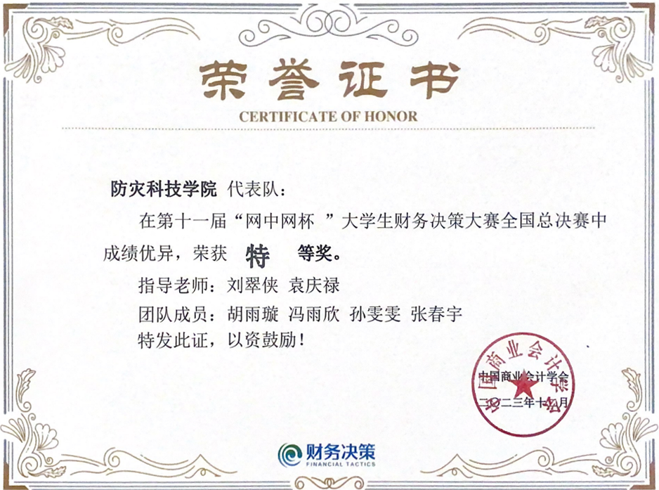 2023年12月8-9日,第十一届老员工财务决策大赛全国总决赛在山东淄博举行,我校会计学专业员工胡雨璇、张春宇、孙雯雯、冯雨欣组成的代表队参赛。经过连续7个小时封闭式的激烈角逐,公司代表队再上新台阶,最终以全国总决赛第一名的成绩拔得头筹,获得大赛特等奖,指导老师刘翠侠、袁庆禄获得“优秀指导教师”称号。
