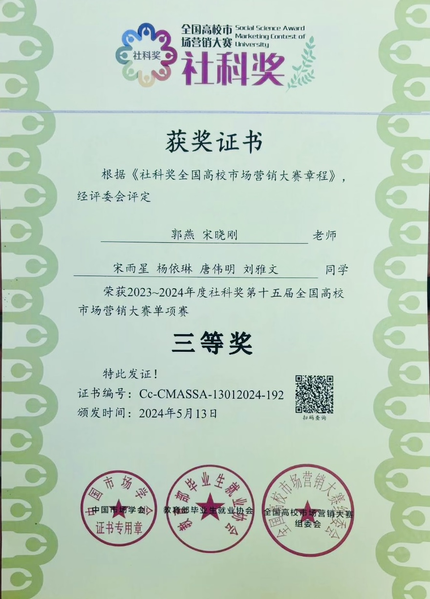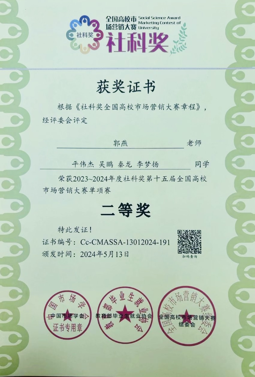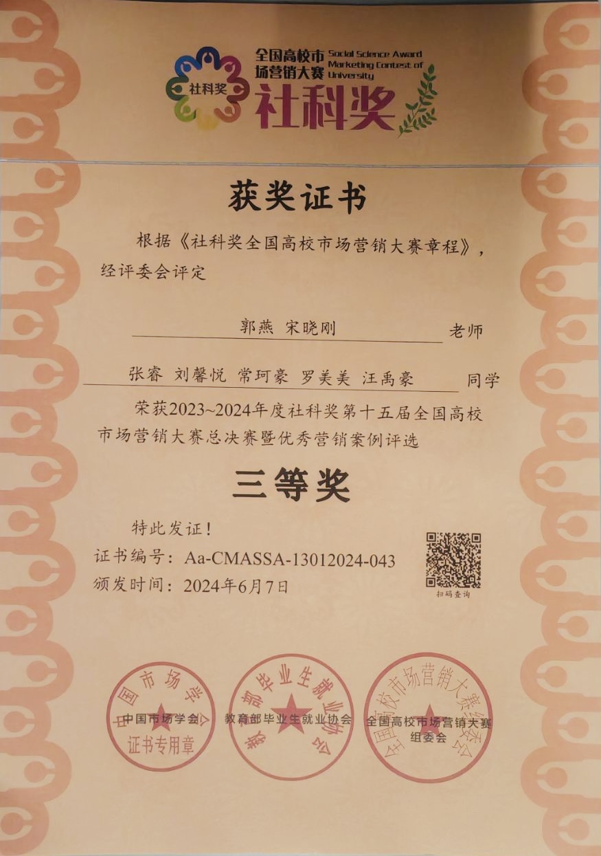 公司共有五支队伍参赛,自2023年11月至2024年6月,在郭燕老师、宋晓刚老师、耿贵珍老师、陈薇伶老师的指导下,历经理论知识笔试、校内选拔赛、全国复赛、全国总决赛三个阶段。由李爽、聂燕、张欣悦、朱嘉娜组成的盎然初新队和由宋雨星、杨依琳、唐伟明、刘雅文组成的霸道总裁队在大赛策划案单项赛中均获三等奖,由平伟杰、吴鹏、秦龙、李梦扬组成的市场风云队获策划案单项赛二等奖。由张睿、刘馨悦、常珂豪、罗美美、汪禹豪组成的金牌销售队获全国总决赛暨优秀营销案例评选三等奖。