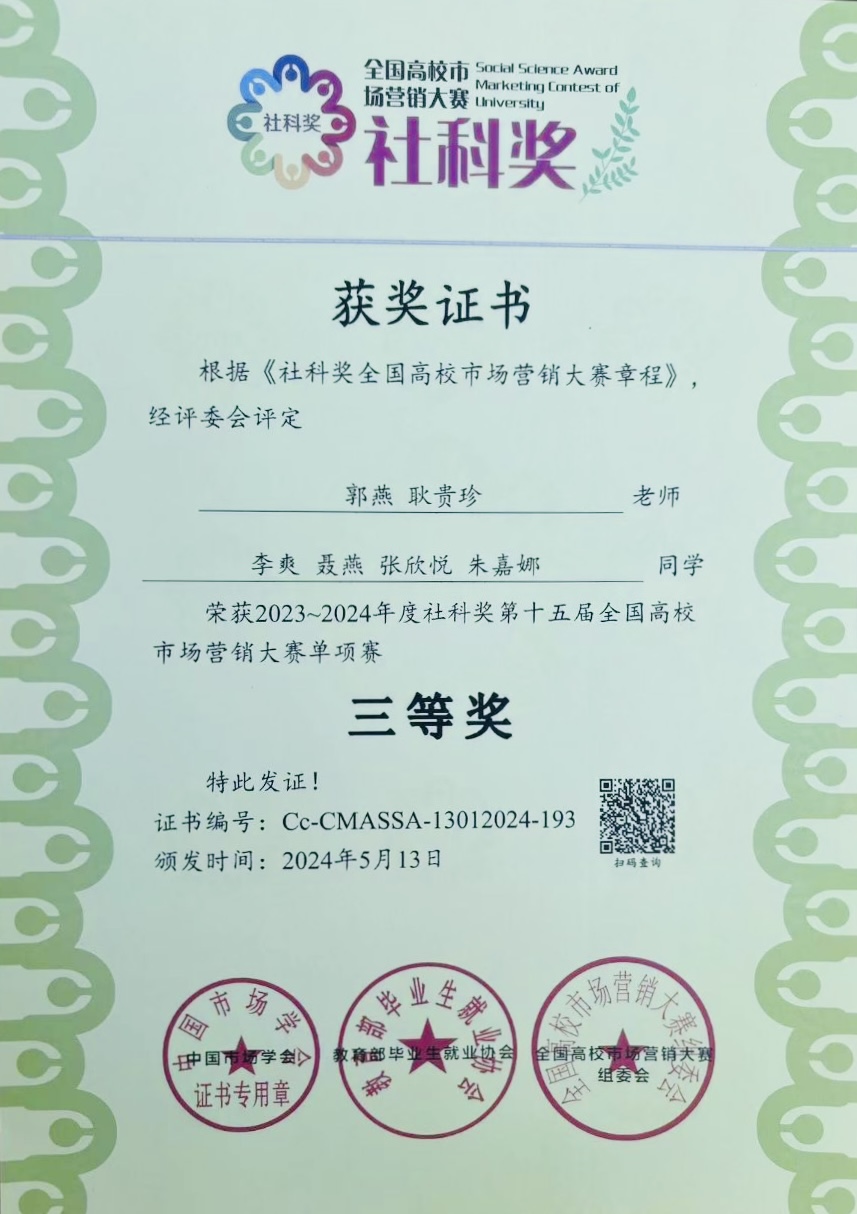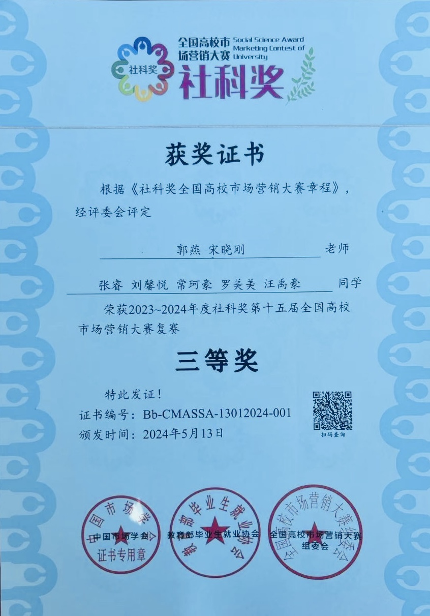 2023-2024年度社科奖第十五届全国高校市场营销大赛全国总决赛于近日在线上举行,公司员工积极参与,并取得佳绩。