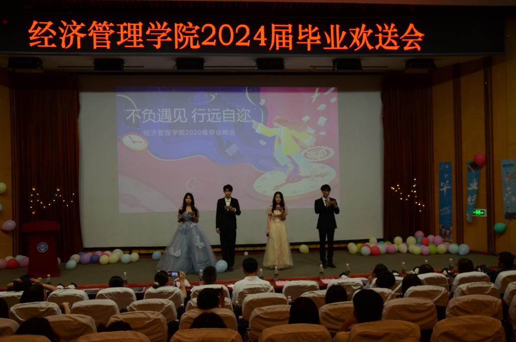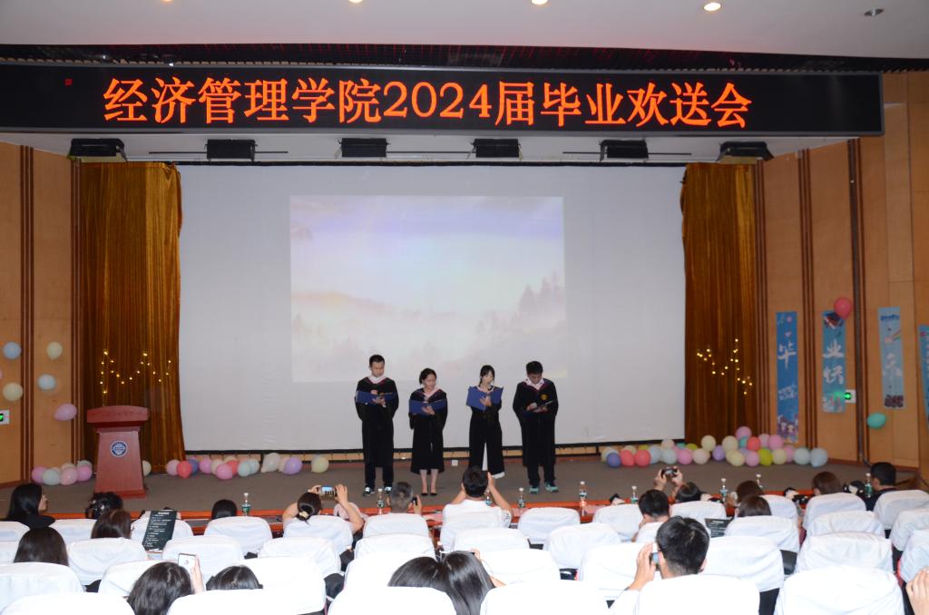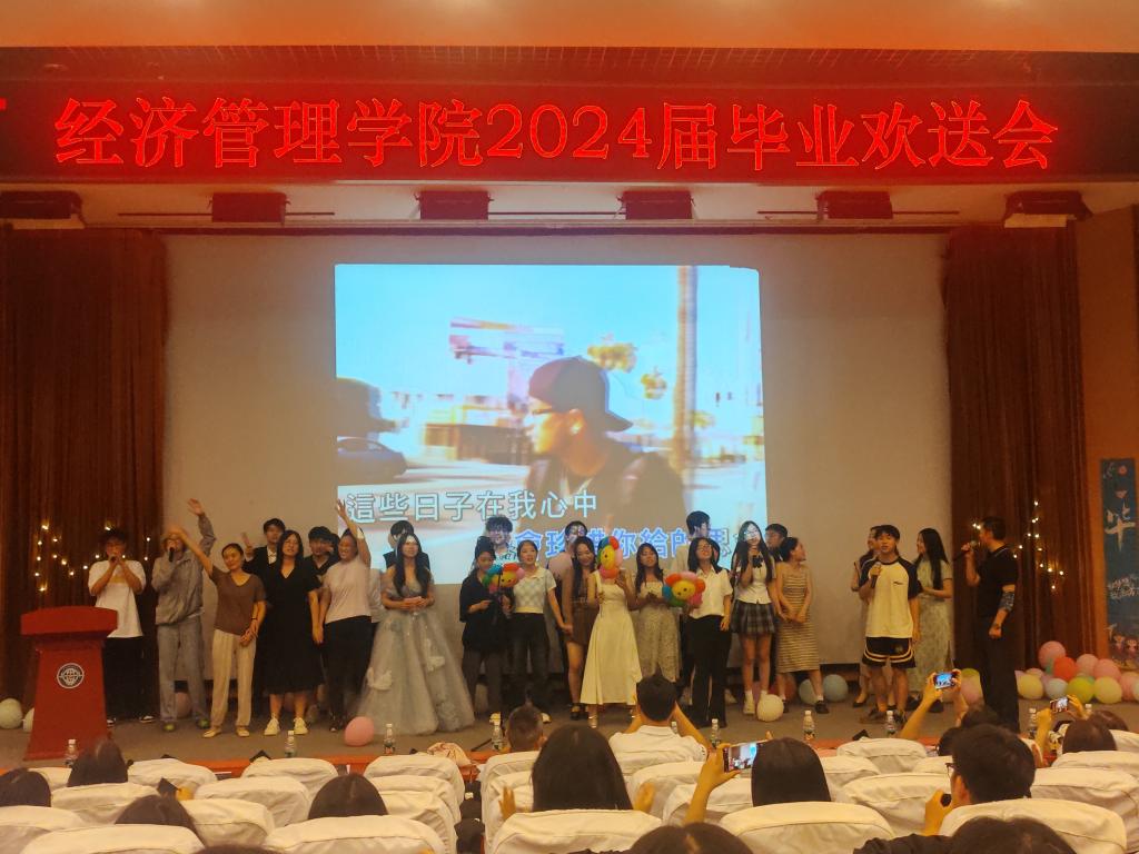 表彰大会后,公司给毕业生送上了毕业纪念礼物,处处体现着老师对毕业生的关爱以及学弟学妹对他们的祝福。欢送毕业生晚会在毕业歌视频中拉开帷幕。舞蹈串烧活力四射,展现了属于她们的青春记忆;串烧毕业季歌曲表达了他们内心对美好单纯的校园生活的留恋;声情并茂的朗诵《有你的夏天》,带领大家重温了大学四年来的美好时光;2024届毕业MV视频中用镜头记录了学长学姐们在校园生活的点点滴滴,勾起了在场毕业生的回忆。《班级回忆相册》,相册中笑着的每一张笑脸,填满了屏幕,更诠释了经管学子最好的精神风貌。歌曲《知足》以及《山脚+夜空中最亮的星》,引发全场合唱,将气氛推向了高潮。《老师寄语》视频,每一位老师寄语都包含着对员工们最真切的祝福和关怀。最后,老师们也给毕业生送上了一首歌《再见》,真正体现了师生相处的融洽。老师也给毕业生们送上了最真挚的祝福。