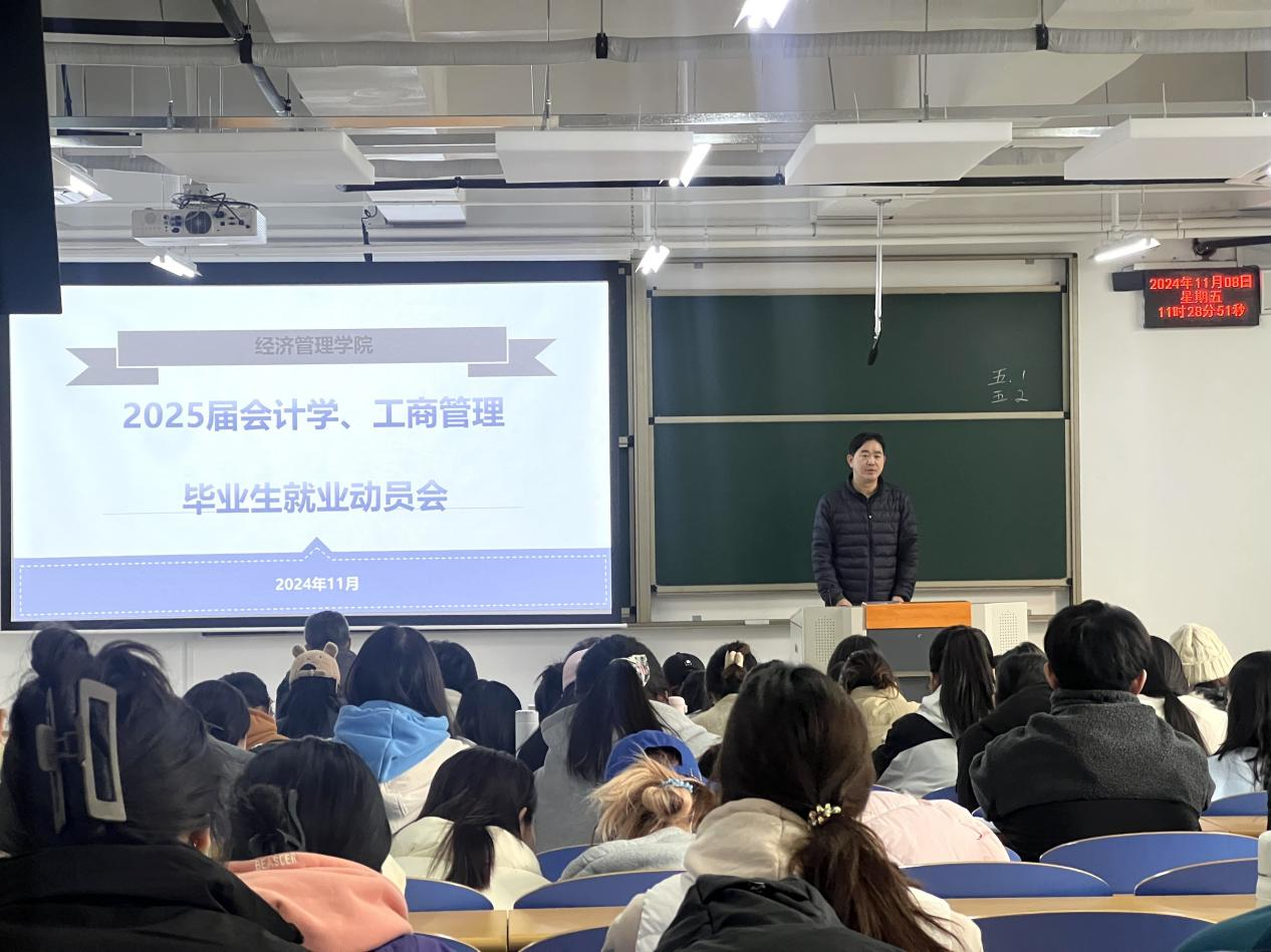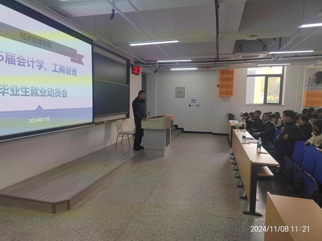 为了让毕业生提高就业意识,帮助毕业生顺利就业,实现就业工作目标,公司11月8日在文德楼S107教室召开了2025届会计学、工商管理专业毕业生就业工作动员会,对同学们进行求职择业指导。公司党总支书记谢长旺、副经理李学林、工商管理教研室主任樊亚宾,辅导员陈杰以及2021级会计学、工商管理专业全体同学参加了此次会议。