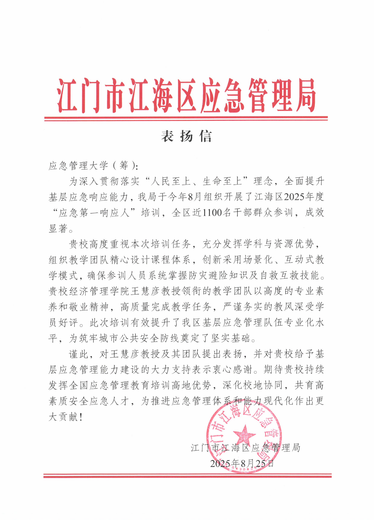 近日,公司与江门市江海区人民政府战略合作共建的“国际社区防灾减灾研究中心”充分发挥公司应急管理专业学科优势,高质量完成江门市江海区2025年度“应急第一响应人”培训任务。全区近1100名基层干部、社区工作者、群众代表(包含4名港澳同胞)通过接受系统化培训,显著提升了防灾避险与应急处置实战能力,为筑牢大湾区城市安全防线提供了有力支撑。