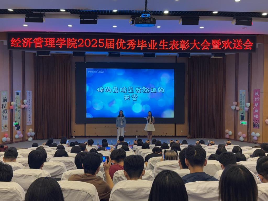 表彰大会后,公司给毕业生送上了毕业纪念礼物,处处体现着老师对毕业生的关爱以及学弟学妹对他们的祝福。毕业生欢送会在毕业歌视频中拉开帷幕。舞蹈串烧活力四射,展现了属于她们的青春记忆;毕业季歌曲表达了他们内心对美好单纯的校园生活的留恋;声情并茂的朗诵《防灾记忆》,带领大家重温了大学四年来的美好时光;2025届毕业MV视频中用镜头记录了学长学姐们在校园生活的点点滴滴,勾起了在场毕业生的回忆。《班级回忆相册》,相册中笑着的每一张笑脸,填满了屏幕,更诠释了经管学子最好的精神风貌。歌曲《岁月神偷》引发全场合唱,将气氛推向了高潮。《老师寄语》视频,每一位老师寄语都包含着对员工们最真切的祝福和关怀。最后,毕业生送上了一首大合唱《我们的明天》,真正体现了毕业生的依依不舍。老师也给毕业生们送上了最真挚的祝福。