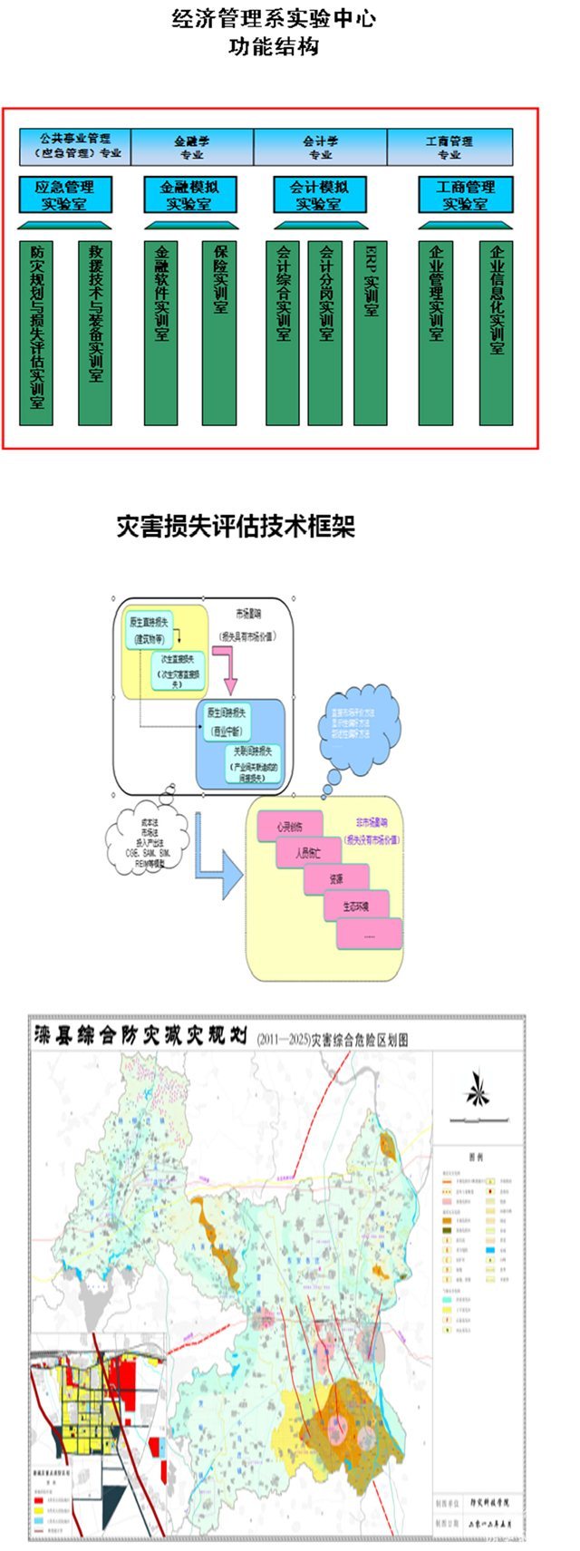中心也是经济管理系进行科研活动的基地,近年来深入开展防灾规划编制与灾害损失评估研究,已经完成了“5.12汶川大地震损失评估”、“河北省唐海县防灾规划”等重大项目,本着“依托行业、服务地方”的办学理念,为地方经济发展和灾害应急管理人才培养提供了必要的条件保障。