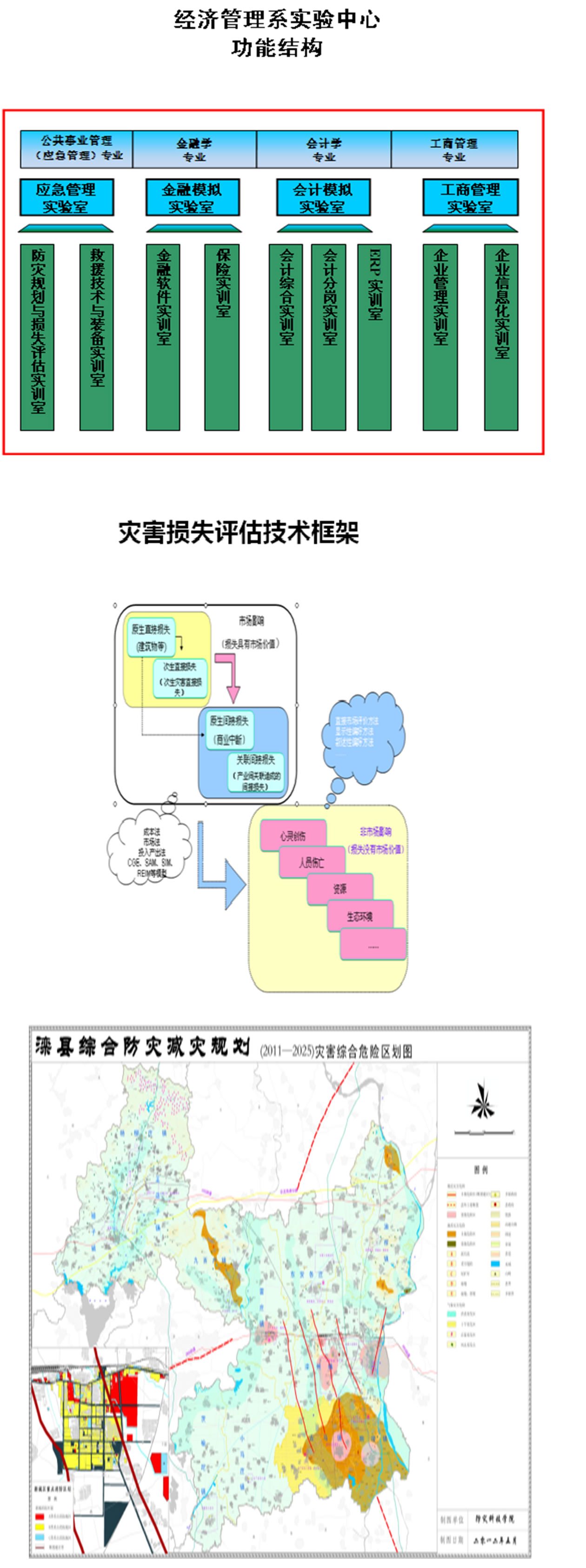 中心也是经济管理系进行科研活动的基地,近年来深入开展防灾规划编制与灾害损失评估研究,已经完成了“5.12汶川大地震损失评估”、“河北省唐海县防灾规划”等重大项目,本着“依托行业、服务地方”的办学理念,为地方经济发展和灾害应急管理人才培养提供了必要的条件保障。