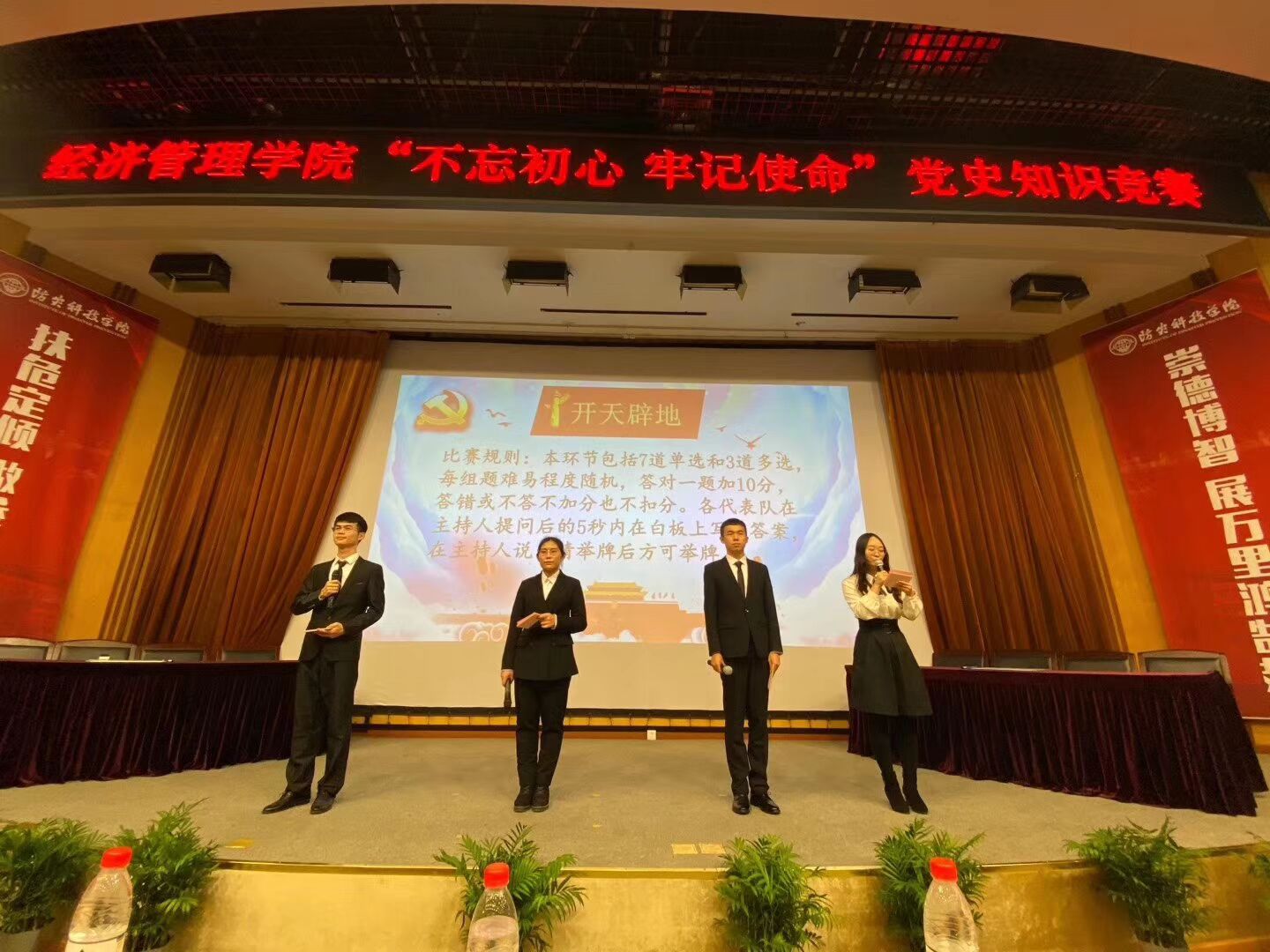 为深入开展“不忘初心、牢记使命”主题教育,让党员和入党积极分子深入学习党史、新中国史, 公司党总支于12月1日在图书馆报告厅举办了第六届“不忘初心、牢记使命”党史知识竞赛决赛。党总支书记谢长旺、党总支副书记陈杰、党总支专职组织员黄义乾、工商管理专业员工党支部书记闫粉粉以及广大党员和入党积极分子参加活动。