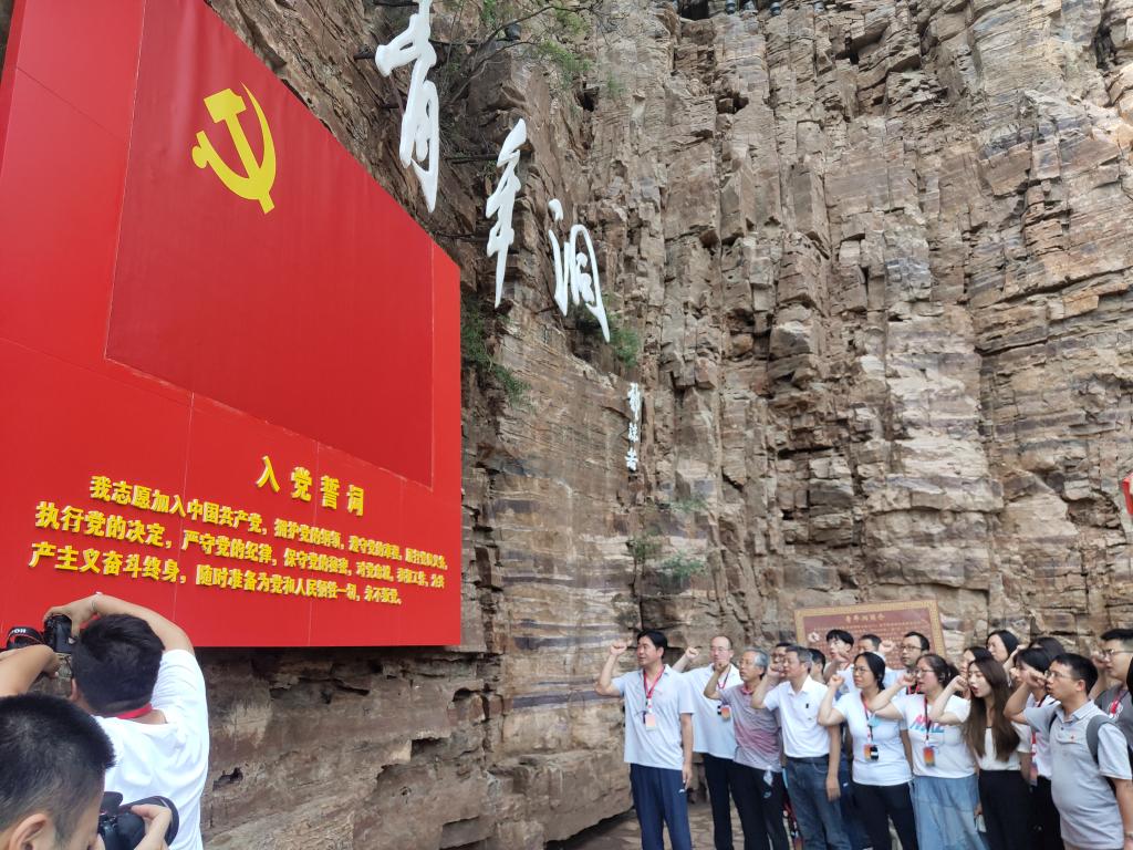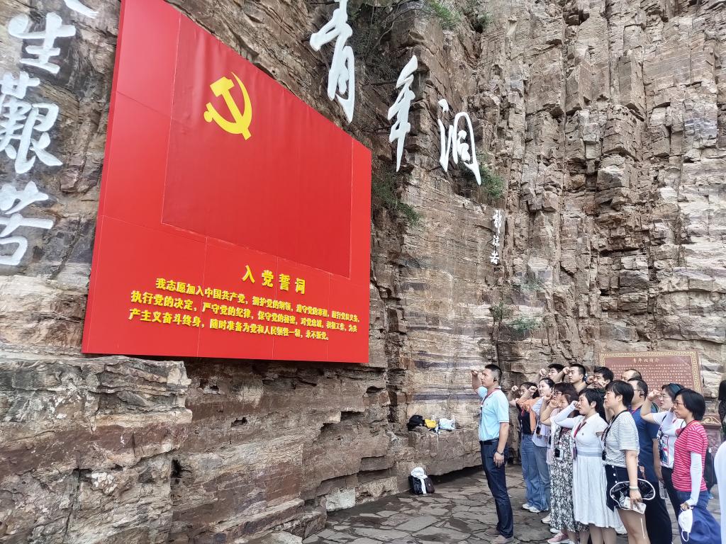 在红旗渠总干渠的咽喉工程——青年洞前,瞩目悬崖峭壁上的“人工天河”,感受到它的雄伟壮观时,大家无不为这一新中国奇迹所赞叹,无不为其中所孕育的“自力更生,艰苦创业,团结协作,无私奉献”的红旗渠精神所感染。全体参访党员在青年洞前,怀着激动的心情重温入党誓词。