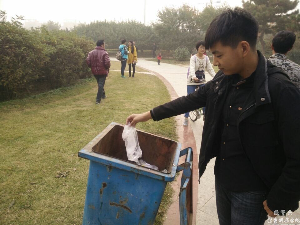 当天下午,在班长蔡昊坤,鲁雨喆的组织下,大家一起步行去燕郊公园进行环保活动——捡垃圾。当天下午风和日丽,公园里人潮涌动,有些人在遛狗的,有些人在散步,有些人···同时也留下了一些垃圾。