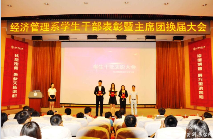为了表彰团总支员工会各部门成员一年的辛勤付出,也为选出下一届主席团,经济管理系特于5月27日晚7:30在图书馆报告厅举行了表彰大会暨主席团换届。出席本次表彰大会的嘉宾有:经济管理系党总支书记谢长旺,团总支书记郑建锋,辅导员黄义乾、陈杰、李魁明、孔雅萌老师,特邀来宾黄凯学长及员工会主席团、各部部长们。