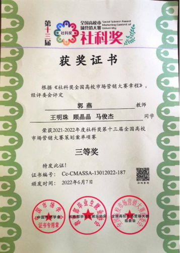 此前,公司一共5支队伍参赛,从2021年10月份开始至今共7个多月,在郭燕老师的指导下,历经理论知识笔试、校内选拔赛、全国复赛及决赛四个阶段;校内选拔了3支队伍参加全国复赛,其中,由王明珠、顾晶晶、马俊杰同学组成的永远好奇又贪玩团队获得“社科奖”第十三届全国高校市场营销大赛策划案单项赛三等奖。